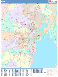 The ColorCAST style Wall Map is a multi-colored display that shades each geographic area with its own background color. It is an ideal choice for applications that benefit from quickly and easily distinguishing one County or Zip Code from the others. The ColorCAST Style Wall Map features streets and highways with maximum streets based upon map size, as well as distinct geographic color shading.
